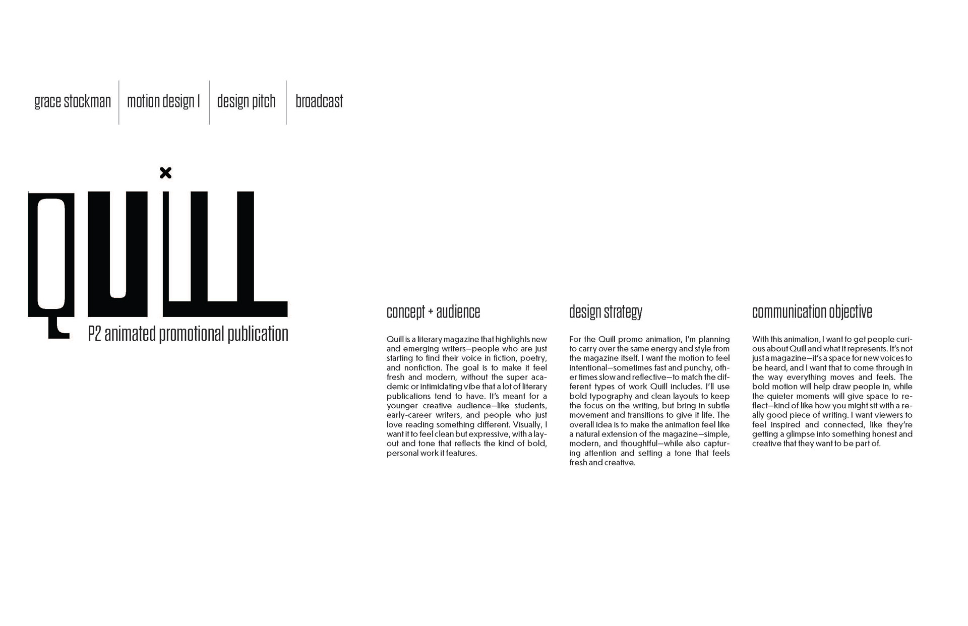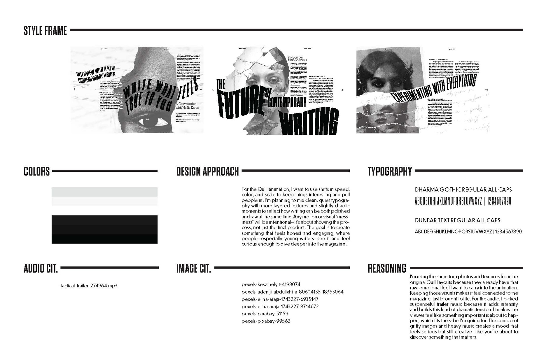 The typography in Quill combines sharp, geometric sans-serifs with experimental custom type treatments, pushing the boundaries of readability to create intrigue and provoke thought. The design prioritizes disruption through bold asymmetry, unconventional grid structures, and layered elements that add depth and texture. A strict black-and-white color palette eliminates distraction, emphasizing contrast, clarity, and the raw essence of the content, while also allowing the typography and layout to take center stage.
