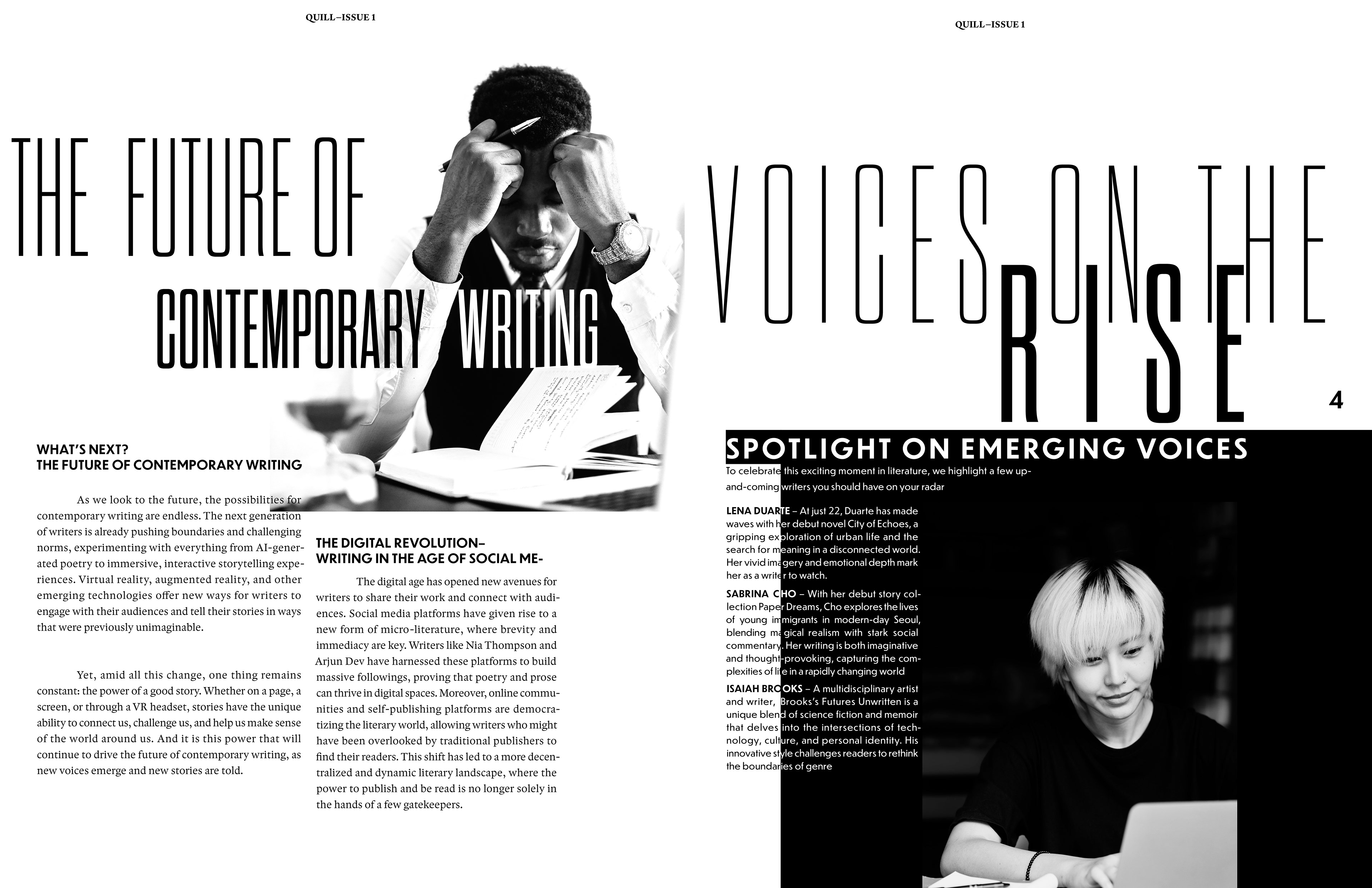 Objective –The goal of Quill is to spotlight emerging contemporary writers by providing a thoughtfully designed platform that amplifies their voices and showcases their work with innovative, engaging typography and visuals.